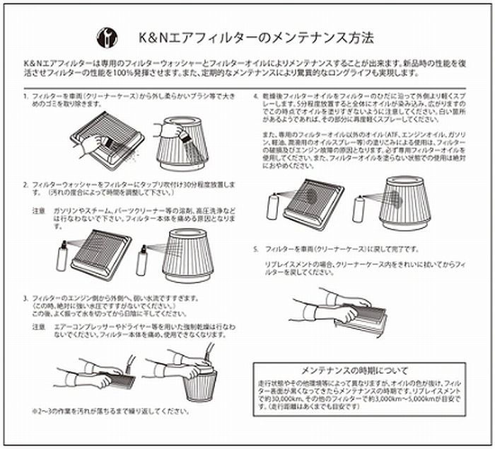 別売りのK&N専用のメンテナンスキット ( 品番 99-5000 ) にて洗浄することで繰り返し使用が可能。