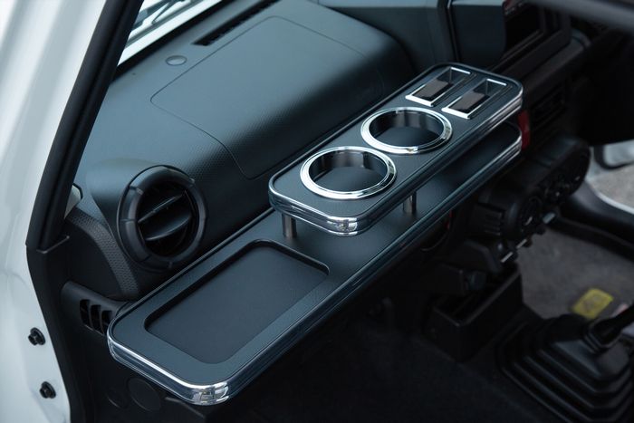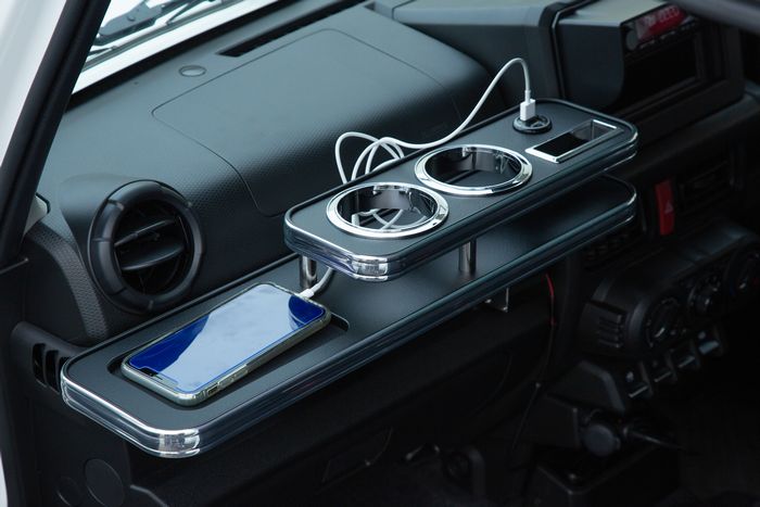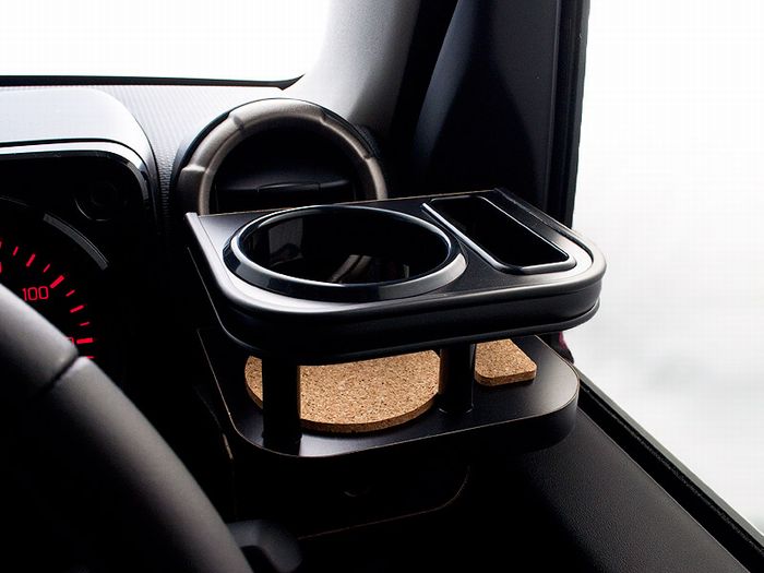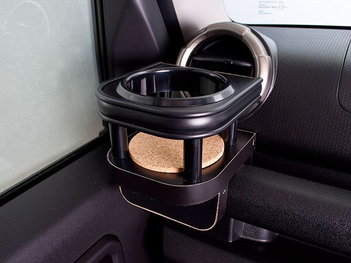 JB64ジムニーのフロント室内周辺に純正ドリンクホルダーなく使いやすさを重視した専用タイプのドリンクホルダーを開発。